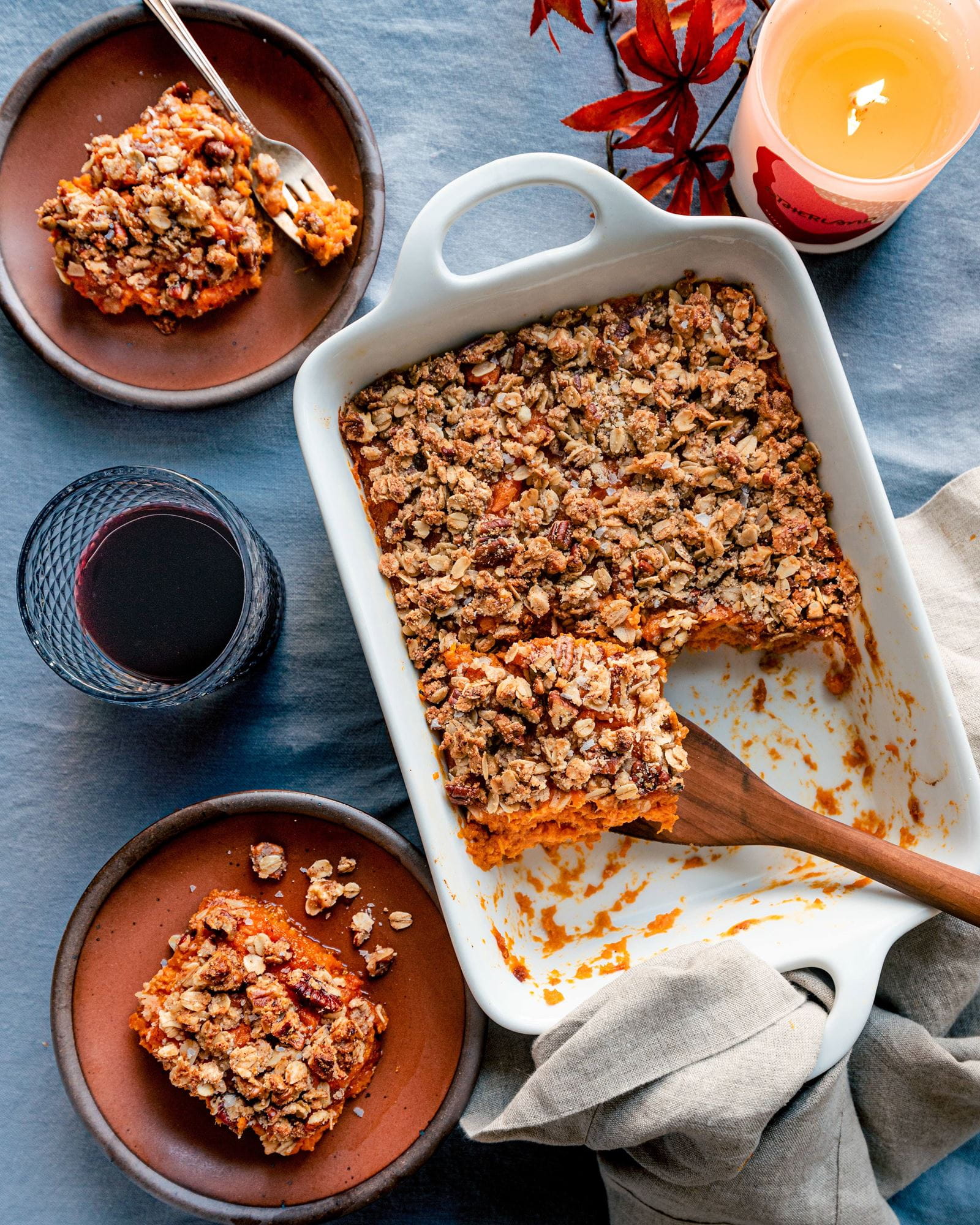 Our Vegan and gluten free Brown Butter Sweet Potato Casserole is like a cross between a sweet potato pie minus the crust. We bake the sweet potatoes, then mash with Country Crock Plant Butter, vanilla, cinnamon, nutmeg and ginger. Then we use more Plant Butter and combine it with oats, almond flour, nuts and spices to make the delicious topping that adds both flavor and crunch.